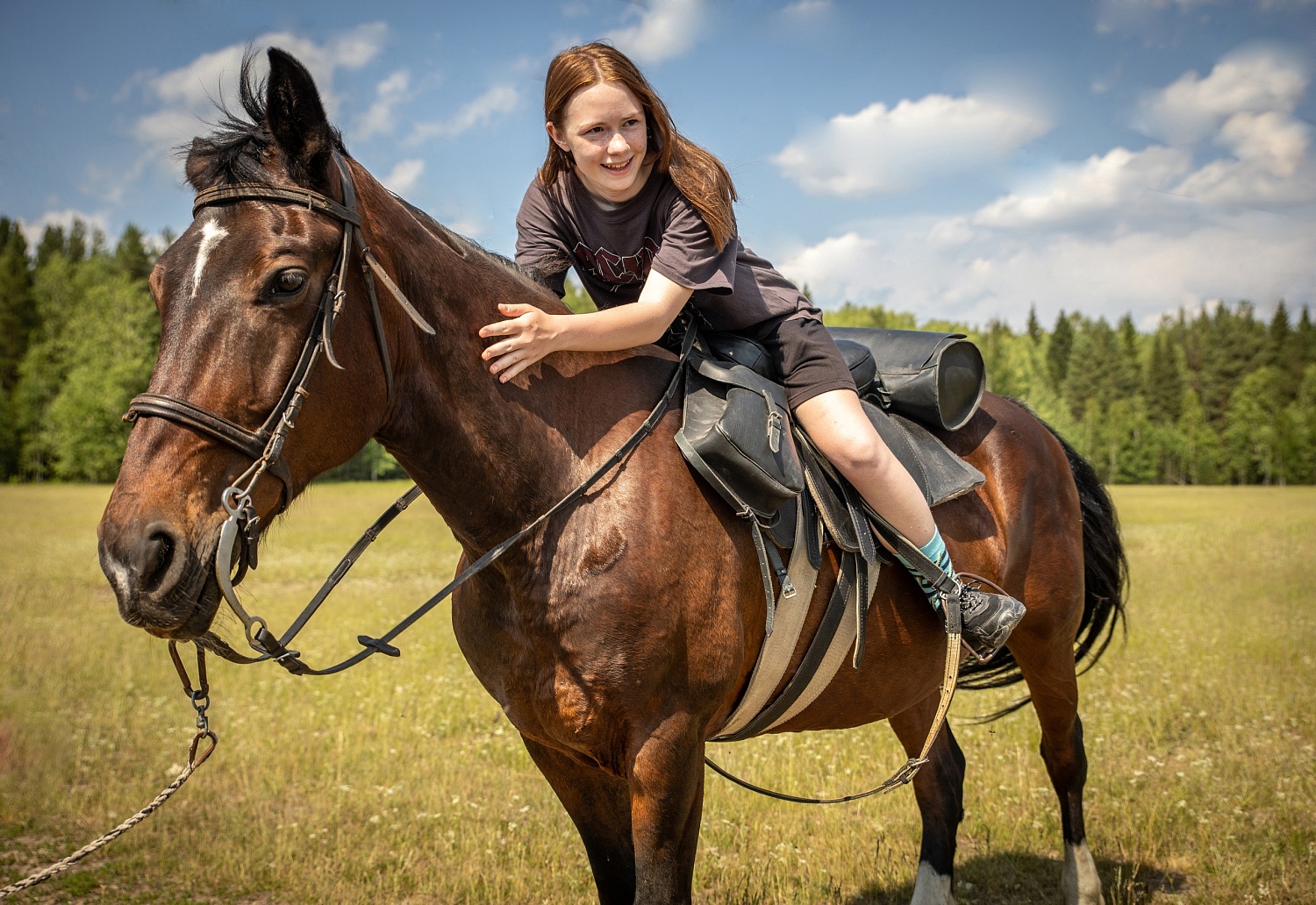 Катание проходит на спокойных и ухоженных лошадках.